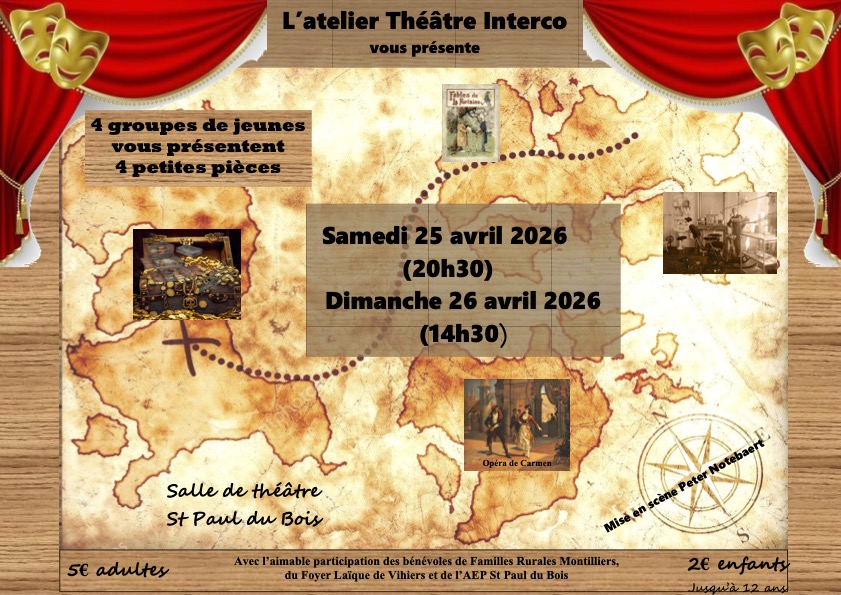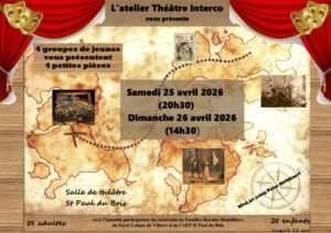 Le FCL vous invite à venir rencontrer les jeunes comédiens du territoire qui ont répété pendant leur vacances scolaires pour vous présenter ce spectacle. Pour pourrez voir 4 groupes de jeunes présenter 4 petites pièces à la salle de Théâtre de Saint-Paul du Bois les samedi 25 à 20h30 et dimanche 26 avril à 14h30. Prix des places : les adultes 5€ et les enfants de moins de 12 ans 12€.
