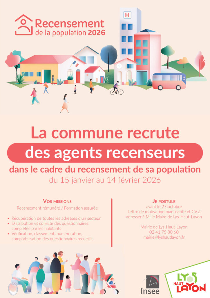 02 41 75 80 60 /mairie@lyshautlayon.fraura lieu début 2026, la commune recherche 17 agents recenseurs.