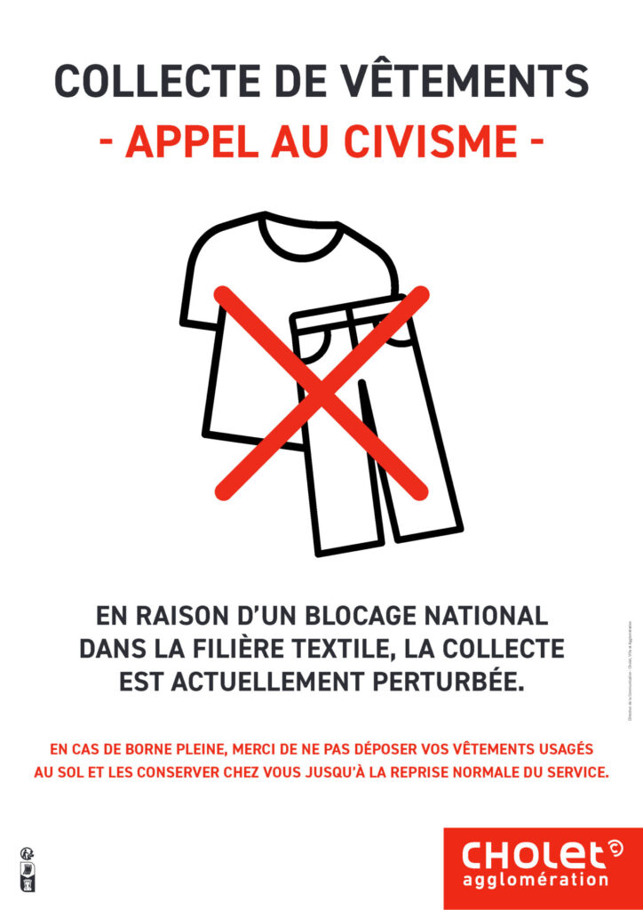 Cholet Agglomération informe les habitants que la collecte des bornes de récupération de vêtements usagés est temporairement perturbée en raison d’une crise nationale qui impacte fortement la filière de collecte et de tri des textiles.