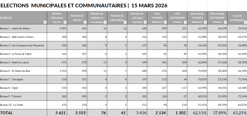 Dimanche 15 mars 2026 ont eu lieu les élections municipales de Lys-Haut-Layon. La liste “Agir au quotidien, penser demain” menée par Médérick THOMAS a devancé celle de Frédéric MATIGNON, “Lys-Haut-Layon Autrement”.