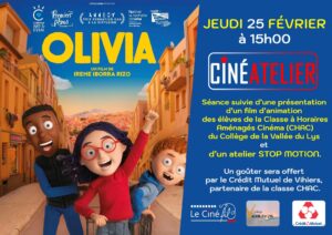 film OLIVIA (à partir de 8 ans) présenté par les élèves de 6ème et 5ème des Classes à Horaires Aménagés Cinéma du Collège de la Vallée du Lys, suivi d’une présentation d’un de leur film d’animation et d’un atelier STOP MOTION (atelier gratuit sans inscription).