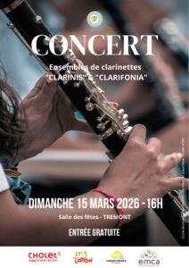 Le dimanche 15 mars, à 16h, à la salle des fêtes de TREMONT, l’école de musique Lys Haut-Layon reçoit les ensembles de clarinettes “CLARINIS” et “CLARIFONIA”. Ces deux ensembles, basés à l’école de musique de Chemillé et au Conservatoire du Choletais, seront dirigés par Dominique LAMBERT et Stéphane LEFORT, professeurs dans ces deux établissements. En première partie, quelques élèves de notre école (clarinette et saxophone) se produiront en trio et quatuor. Le concert se terminera avec deux morceaux joués par les clarinettistes des trois écoles. Entrée gratuite.