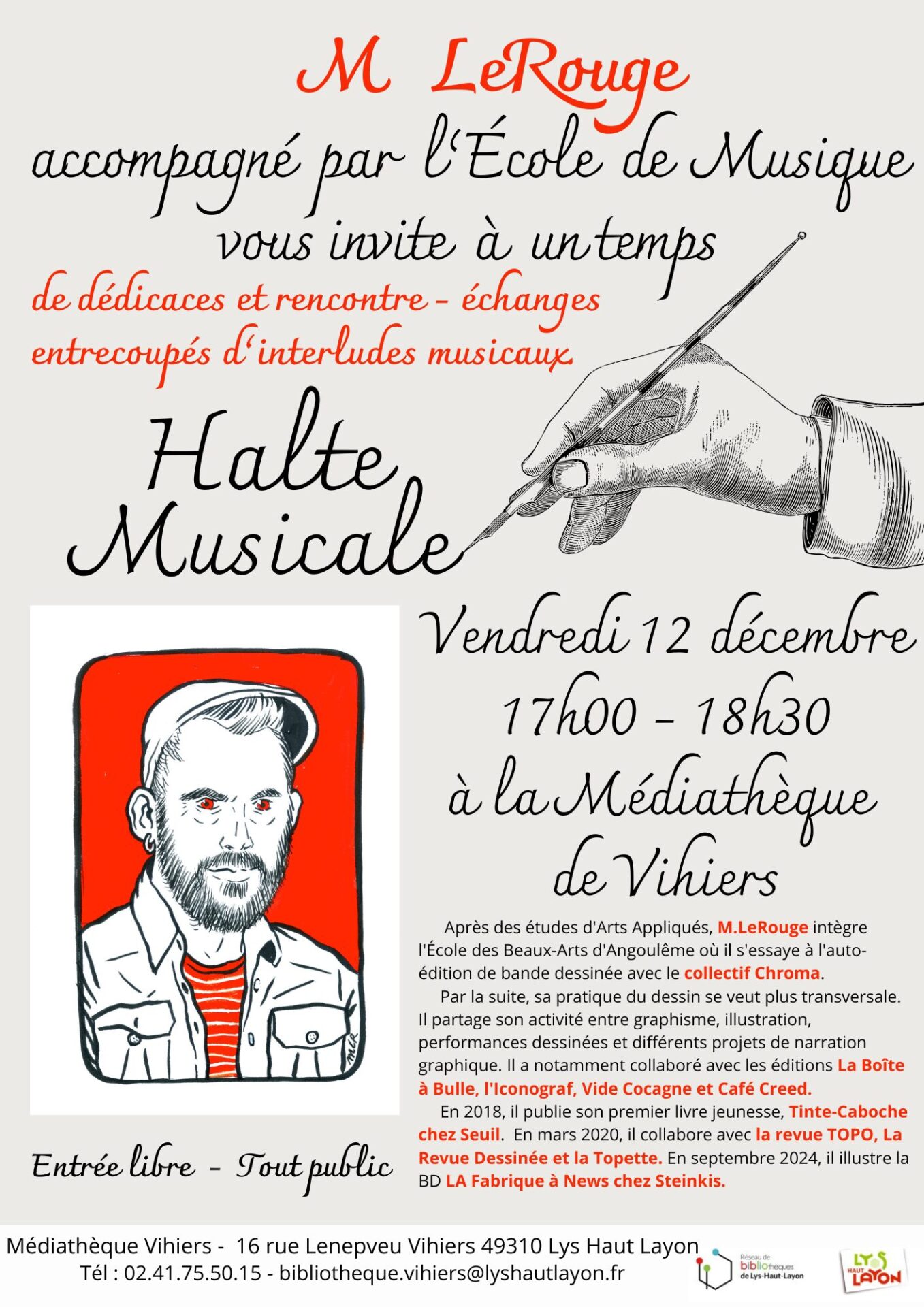 L’école de musique et la bibliothèque s’associent pour une rencontre musicale avec le dessinateur Matthieu ROUGÉ, vendredi 12 décembre de 17h à 18h30 à la médiathèque de Vihiers.