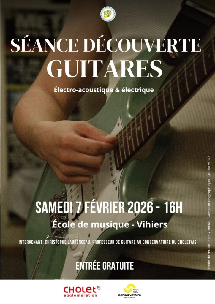 L’école de musique invite Christophe LAURENCEAU, professeur de guitare du département “Musiques amplifiées et improvisées” du Conservatoire du Choletais, pour une présentation des différents types de guitares (électro-acoustique et électrique) et styles de musiques (jazz, blues, rock, folk). L’improvisation sera aussi abordée. Séance d’1h30 environ, à l’école de musique, samedi 7 février, 16h. Entrée gratuite.